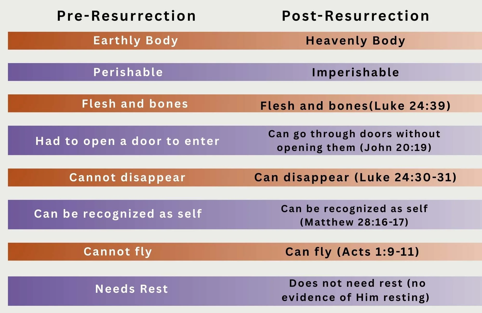 There are those who would say that the bodies we will receive will be spiritual only, basically ghost-like features. But this cannot be if Jesus was the first fruits from the grave and we are the rest. Jesus did not raise from the dead with a ghost-like body. There were similarities and differences in His pre-resurrection body and His post-resurrection body.